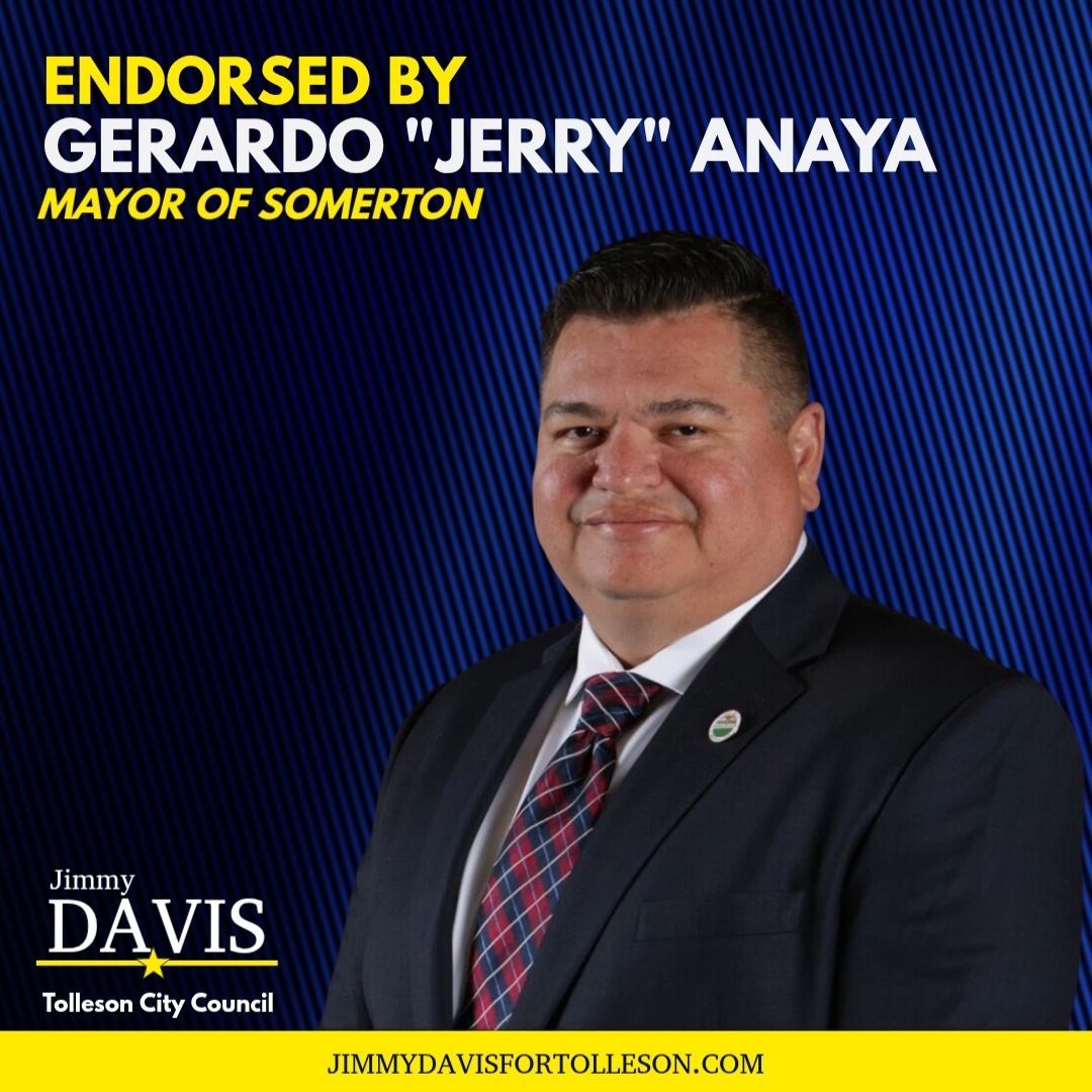 Join Jimmy Davis’s campaign to strengthen Tolleson by volunteering your time, donating, or requesting a yard sign. Your support helps maintain safe neighborhoods, strong local services, and a city government that listens and delivers for all residents.